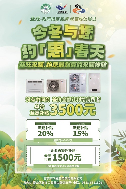 在這個寒冷的季節,選擇圣旺品牌的空氣源熱泵熱風機、燃氣壁掛爐及空氣能機組等采暖設備,不僅能享受優惠補貼,更是為環保貢獻一份力量。歡迎廣大消費者前來選購,讓我們一起溫暖過冬!