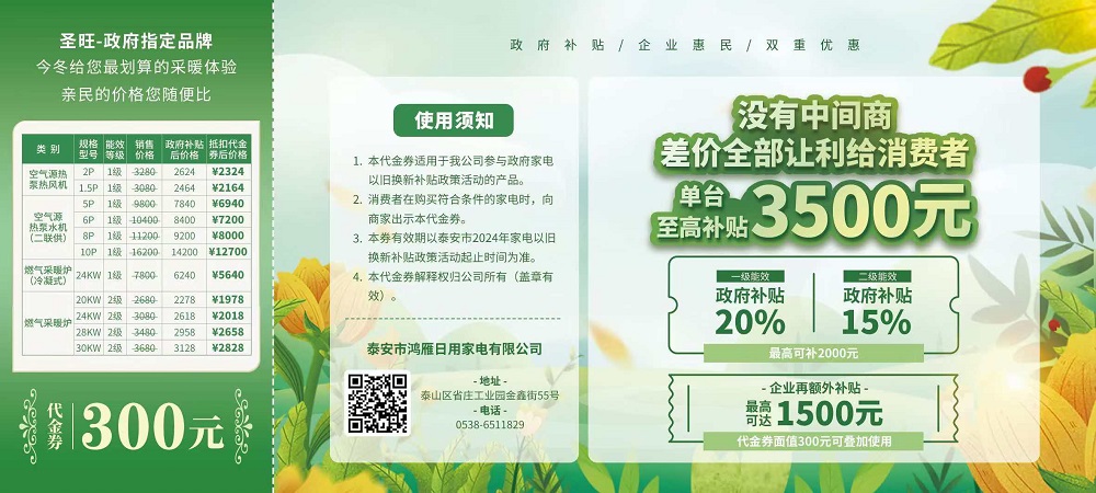 如今,泰安市舉行家電以舊換新補貼政策,我公司三類產品成功入圍,包括空氣源熱泵熱風機、冷水機組和燃氣壁掛爐。消費者購買我公司一級能耗產品可享受政府 20%的補貼,二級能耗產品可享受 15%的補貼。在此基礎上,我們面向全市消費者再額外發放 300 萬的代金券,單張面值 300 元,共 1 萬張。這意味著在政府補貼的同時,消費者還能享受我公司讓利 300 至最高 1500 元的優惠,真正實現政企雙補,福利翻倍。